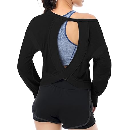EYZH Women's Open Back Workout Top - Long Sleeve Yoga Crop Top with Thumb Holes, Breathable Athletic Shirt, Black, L