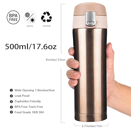 Thông tin sản phẩm FAPPEN Double Walled Vacuum Flask Thermo, 500ml Stainless Steel Insulated Water Bottle, Flask for Hot and Cold Drinks, Travel Coffee Mug, Sports Water Bottle, Drinks Cup (Gold)