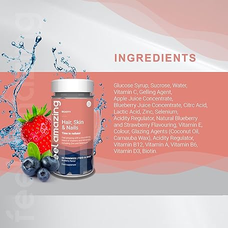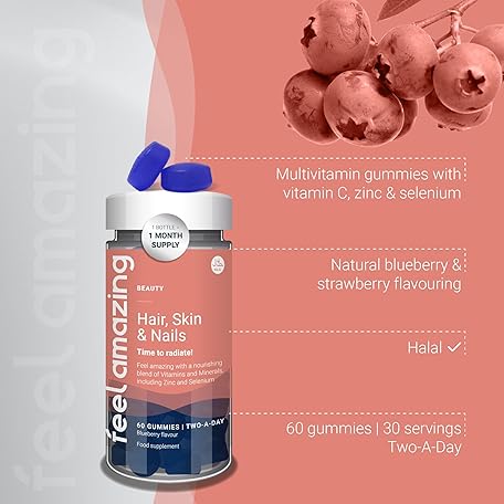 Thông tin sản phẩm Feel Amazing Hair, Skin & Nails Gummies - Zinc, Biotin & Vitamin C - Blueberry Flavoured - Vegetarian - 60 Gummies - 30 Servings - 1 Month Supply