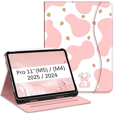 Fintie Case for iPad Pro 11 Inch M4 (2024) (Model Number: A2836/A2837/A3006) with Pencil Holder, Multi-Angle Viewing Folio Stand Protective Case with Document Slots, Strawberry Cow
