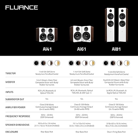 Thông tin sản phẩm Fluance Ai61 Powered 2-Way 2.0 Stereo Bookshelf Speakers with 6.5" Drivers, 120W Amplifier for Turntable, TV, PC and Bluetooth 5 Wireless Music Streaming - RCA, Optical, USB & Sub Out (Natural Walnut)