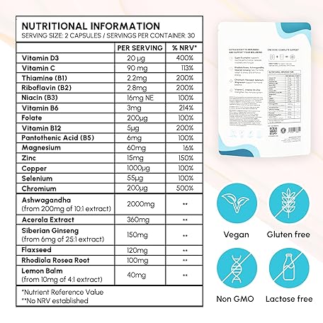 Thông tin sản phẩm Focus & Vitality Multivitamin with Ashwagandha, Vitamin C & Magnesium – Supports Energy, Concentration & Mental Performance – 2000mg Formula | 60 Capsules | Made in The UK - I'm Feeling Burnt Out