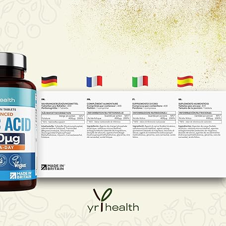 Thông tin sản phẩm Folic Acid 400 mcg Tablets - 400 Vegan Vitamin B9 Tablets for Women, 13 Month Supply, Folic Acid Pregnancy for Normal Function of Immune System and Maternal Tissue Growth - Made in The UK by YrHealth