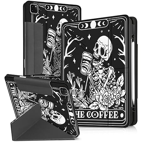 for iPad Air 13 Inch M3 2025 & M2 2024 Case for iPad Pro 12.9 inch 2022/2021/2020/2018 Case - Folio Protector Cover with Pencil Holder Cute Cool Cartoon for Boys Girls, Coffee Skull