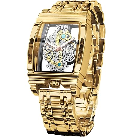 FORSINING Men's Luxury Hollow Skeleton Watch Retro Gorgeous Gear Carving Design Rectangle Tonneau Large Dial Leather Belt & Stainless Steel Band Quartz Wristwatch Not Mechanical Watches