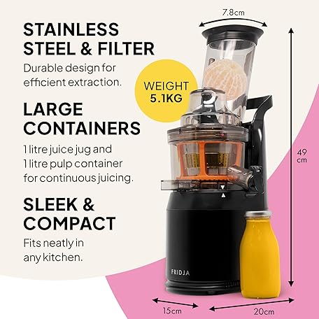 Sản phẩm Fridja f1900 Cold Press Juicer, 240W Masticating Slow Juicer with 78mm (3”) BPA-Free Wide Chute, Black Stainless Steel body, Juice, Vegan Nut Milks, Sorbet, Ice Cream, Easy to Clean đang được bán với giá ưu đãi là $174.5962 tại nước Anh.