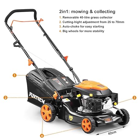 FUXTEC FX-RM4346ECO Petrol Lawnmower, Motor with Easy Clean 2-in-1 Motor Mower Cutting Width 42 cm - 40 L Grass Catcher Basket