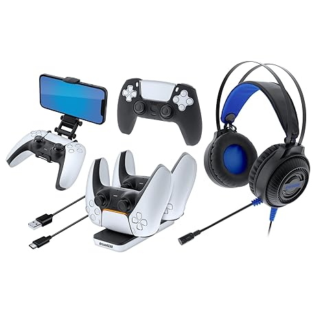 Thông tin sản phẩm Gamers Kit For PlayStation 5: Gaming Headset with 50mm Drivers, PS5 Controller charger, Adjustable Phone Mount, USB-C Cable, Protective Cover and Caps