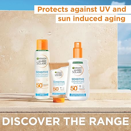Thông tin sản phẩm Garnier Ambre Solaire SPF 50+ Sensitive Advanced Dry Mist Sun Cream Spray, Water Resistant & Non Greasy Sunscreen, Fragrance Free, UVA & UVB Protection, 150ml