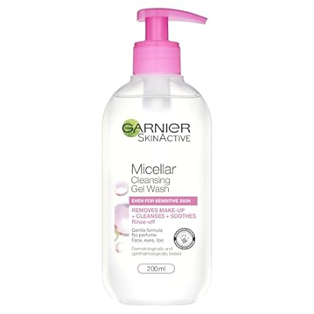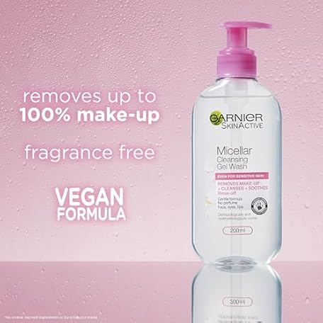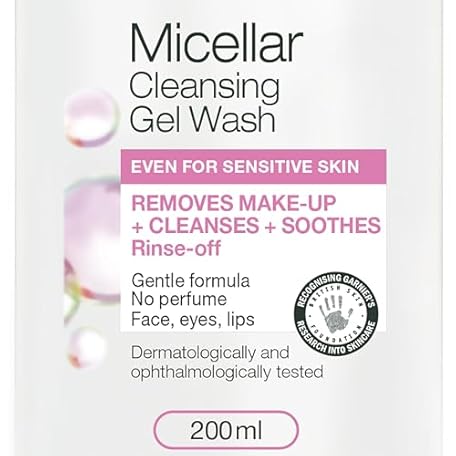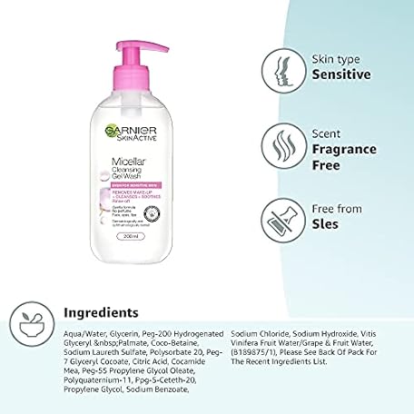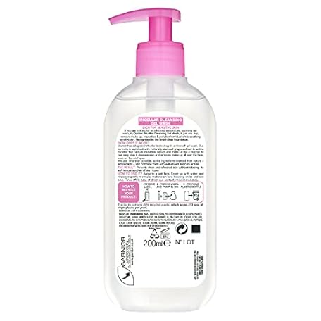 Thông tin sản phẩm Garnier Micellar Gel Face Wash For Sensitive Skin 200ml, Gentle Face Cleanser & Makeup Remover, Recognised By The British Skin Foundation, Rinse-Off, Non-Drying & Fragrance Free Formula