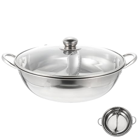 GARVALON Thickened Stainless Steel Shabu Hot Pot with Divider and Tempered Glass Lid for Induction Cooktop Cooking Pot for Family and Party Use