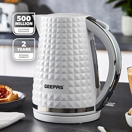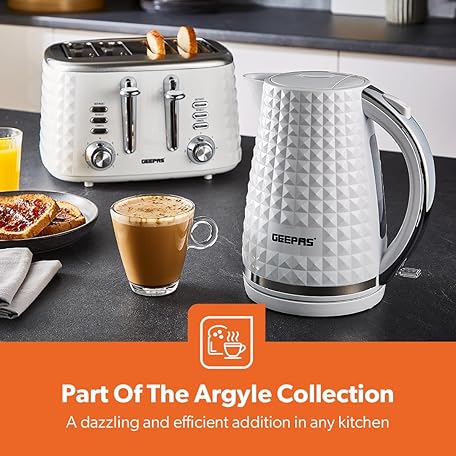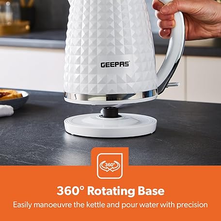 Thương hiệu GEEPAS là cái tên nổi tiếng được rất nhiều khách hàng trên thế giới chọn lựa. Với kiểu dáng đẹp mắt, sang trọng, sản phẩm GEEPAS 1.7L Cordless Electric Kettle | Textured Kettle with 360° Rotational Base & Concealed Heating | Auto Shut Off Boil Dry Sensor | Space Saving Cord Storage and LED Indicator | 2200W Argyle White  là sự lựa chọn hoàn hảo nếu bạn đang tìm mua một món  cho riêng mình.
