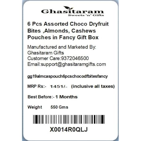 Thông tin sản phẩm Ghasitaram Gifts Christmas Gifts Christmas Chocolates 6 Pcs Assorted Choco Dryfruit Bites 150 GMS,Almonds 200 GMS, Cashews 200 GMS Pouches in Fancy Gift Box