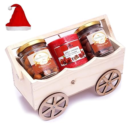 Ghasitaram Gifts Christmas Gifts Natural Wooden Cart with Crunchy Cashews, Scented Candle and Chocolate Coated Almonds