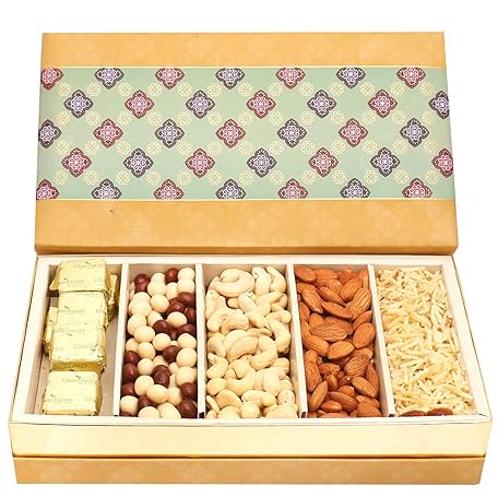 Ghasitaram Gifts Diwali Gifts Diwali Dryfruit - 5 Part Print Almonds, Cashews, Nutties, Namkeen and Chocolate Box