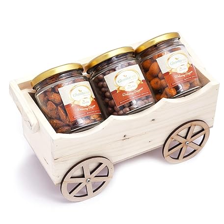 Ghasitaram Gifts Diwali Gifts Natural Wooden Cart with Chocolate Coated Butterscotch, Crunchy Coated Cashews and Peri Peri Almonds Jars