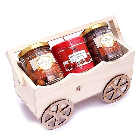 Ghasitaram Gifts Diwali Gifts Natural Wooden Cart with Crunchy Cashews, Scented Candle and Chocolate Coated Almonds