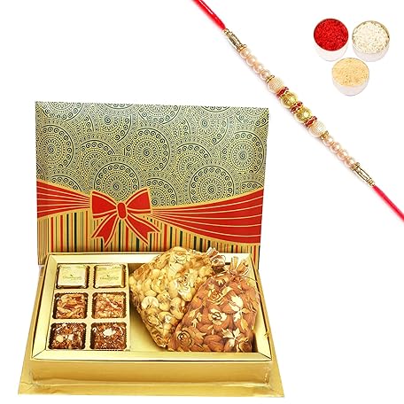 Ghasitaram Gifts Rakhi Gifts for Brothers Rakhi Chocolate 6 Pcs Assorted Choco Dryfruit Bites,Almonds, Cashews Pouches in Fancy Gift Box with Pearl Rakhi