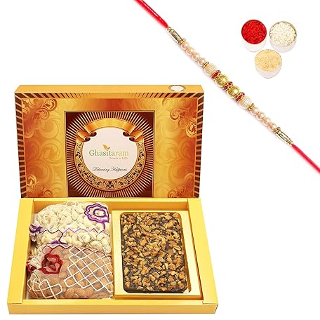 Ghasitaram Gifts Rakhi Gifts for Brothers Rakhi Chocolate Big Box of Walnut Chocolate Bark, Almonds and Cashews Pouch with Pearl Rakhi