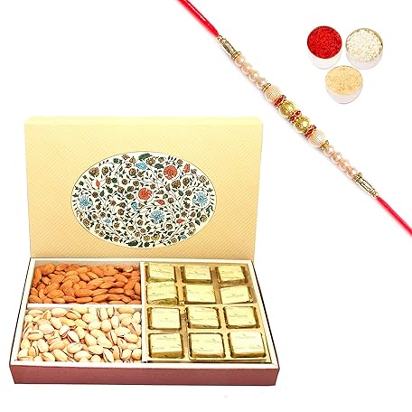 Ghasitaram Gifts Rakhi Gifts for Brothers Rakhi Chocolate Eco 4 Part Print 12 Pcs Chocolates,Almonds and Pistachios Hamper Box with Pearl Rakhi
