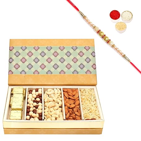 Ghasitaram Gifts Rakhi Gifts for Brothers Rakhi Dryfruit Hampers - 5 Part Print Almonds, Cashews, Nutties,Namkeen and Chocolate Box with Pearl Rakhi