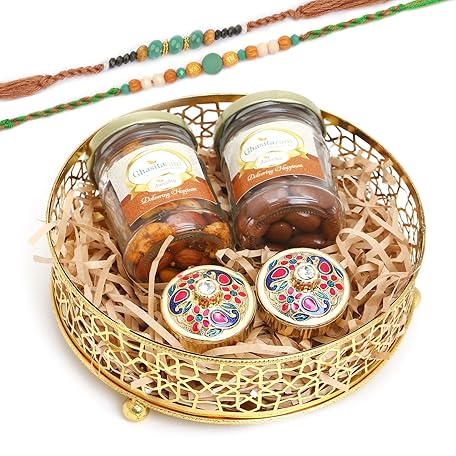 Ghasitaram Gifts Rakhi Gifts for Brothers Round Basket of Jars of Mix Dryfruits, Chocolate Almond, Roli Chawal Containers and 2 Rakhis