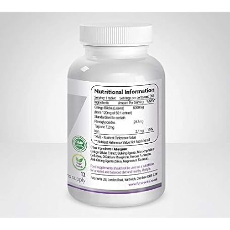 Sản phẩm Ginkgo Biloba 6000mg 365 Tablets High Strength Tablets Ginkgo Biloba Extract Vegan and Gluten Friendly Made in UK Futurevits One Years Supply đang được bán với giá ưu đãi là $20.1541 tại nước Anh.