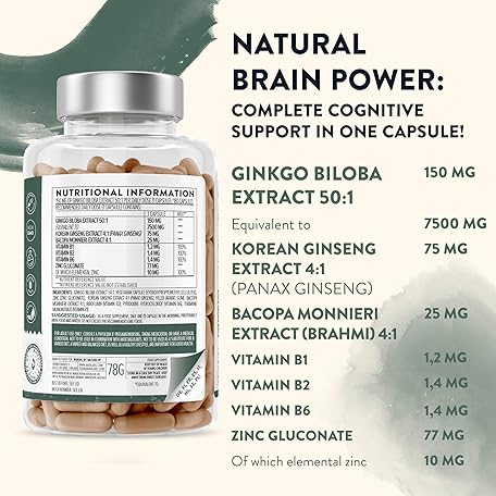 Thông tin sản phẩm Ginkgo Biloba High Strength -7500mg (50:1 Extract) + Bacopa Monnieri, Ginseng and Ginkgo Biloba Herbal Supplements + VIT B6, B1, B2, & Zinc -180 Nootropic Ginkgo Biloba Capsules - Packed w/Flavonoids