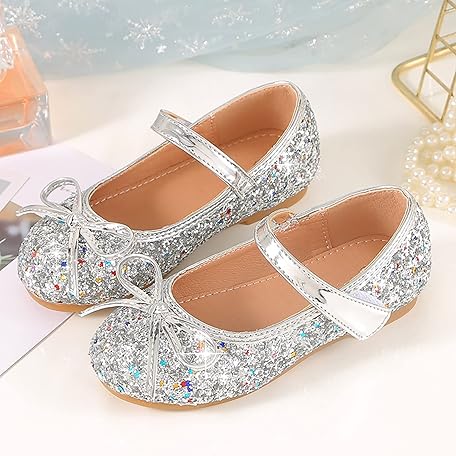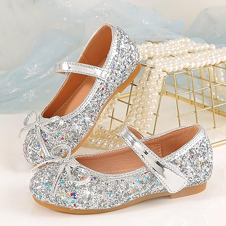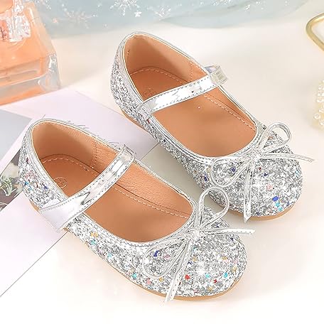 Girls' Sequined Bowknot Flat, Sparkly Crystal Leather Shoes for Girls, for Weddings as Bridesmaid, Flower Girl, Birthday Parties, and 𝗕all Gowns (Silver, 1.5 Big Kids)