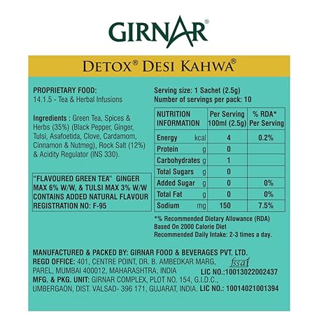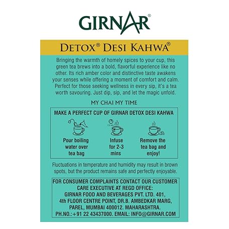 Thương hiệu GIRNAR là cái tên nổi tiếng được rất nhiều khách hàng trên thế giới chọn lựa. Với kiểu dáng đẹp mắt, sang trọng, sản phẩm GIRNAR Detox Green Tea Bags - Desi Kahwa, 10 Bags là sự lựa chọn hoàn hảo nếu bạn đang tìm mua một món cho riêng mình.