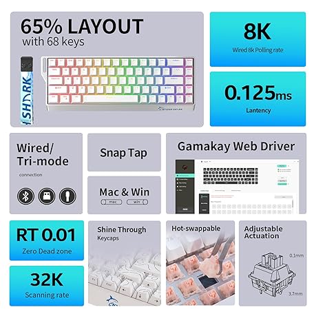 Thông tin sản phẩm GK GAMAKAY x NaughShark NS68 Rapid Trigger Wired Gaming Keyboard, 65% Hall Effect Mechanical Keyboard, 8KHz Polling Rate 0.01mm RT, Snap Tap, Outemu Peach Crystal Magnetic Switch (White-Shine Through)