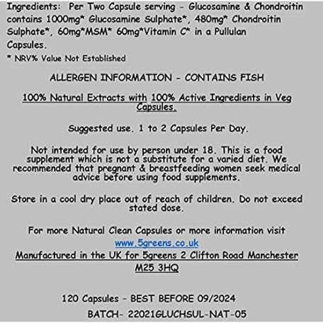 Thông tin sản phẩm Glucosamine and Chondroitin 1600mg per Serving with MSM Extra Absorbency Enriched with Natural Vitamin C, Glucosamine Sulphate 2KCL Chondroitin Sulphate 120 Capsules Made in UK by 5greens
