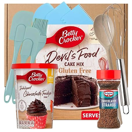 Thông tin sản phẩm Gluten Free Chocolate Cake Making Kit Bundle With Betty Crocker Cake Mix, Chocolate Fudge Icing, Sprinkles, Cake Accessories incl Spatula Baking Set, Whisk, Wooden Spoon & 3 cake spreaders.
