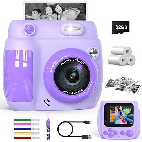 Gofunly Kids Camera Instant Print, 1080P 2.4'' Digital Camera for Kids with 32GB Card & 3 Rolls Print Paper, Birthday Gifts Toys for Boys Girls Ages 3-12,Purple