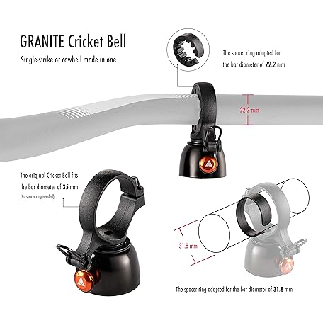 Granite Cricket Mountain Bike Bell with Single-Strike Mode and Constant Cowbell Mode, Bike Bell for Mountain Bike, BMX Bike, Road Bike and Gravel Bike, Bicycle Bell for 22.2mm to 35mm Handlebars
