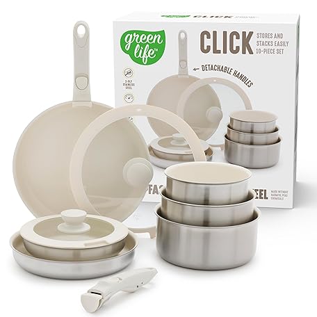 GreenLife 10 Piece Stainless Steel Pots and Pans, Detachable & Stackable Kitchen Set, Tri Ply Ceramic Nonstick PFAS Free Cookware, Space Saving with Removable Handle, Induction & Oven Safe, Glass Lid
