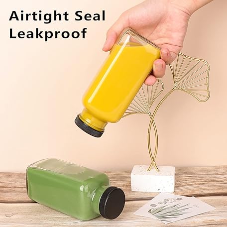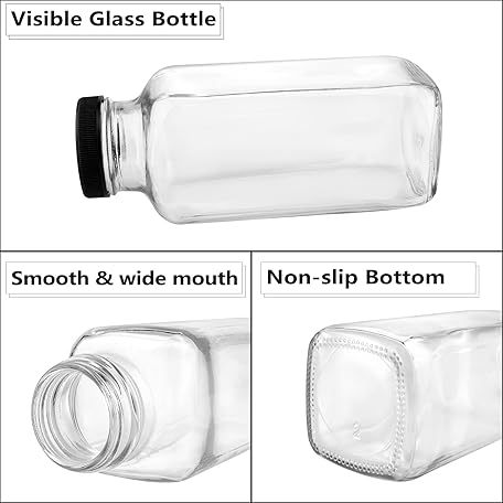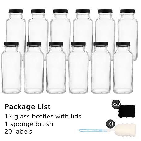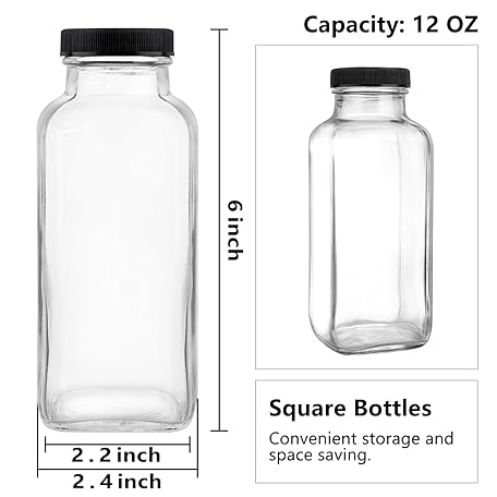 Thông tin sản phẩm GUANENA 12 Pack Glass Drink Bottles, 12 OZ Vintage Square Water Bottles with Lids, Juice Bottles Beverages Containers for Milk, Kombucha, Smoothies