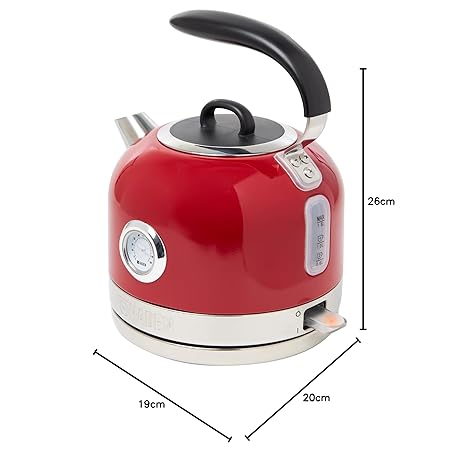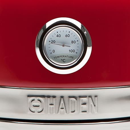 Thông tin sản phẩm Haden Jersey Red Kettle - 1.5L Temperature Gauge & indicator Light - Electric 3000w Rapid Boil Auto Shut-off, Boil-dry Protection, Stainless Steel Retro Design Hot Water Boiler