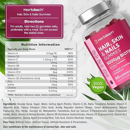 Thông tin sản phẩm Hair Skin and Nails Vitamins | 5000mcg Biotin | Hair Growth Vitamins | with Added Zinc, Vitamin C, E & More! 60 Vegan Gummies | Supplement for Women and Men | by Horbaach