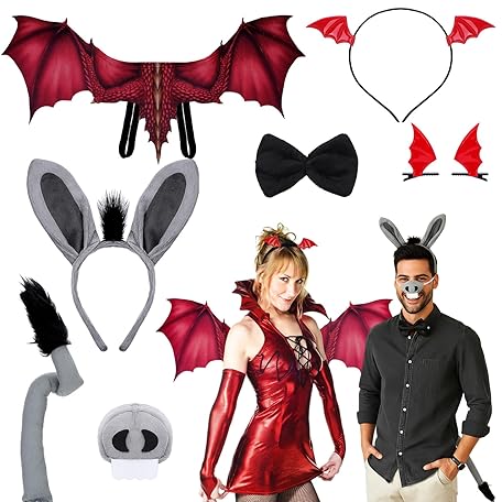 Halfchet 8 Pcs Halloween Dragon Donkey Costume Adult Couple Costume Set Devil Wings Donkey Ears Tail Nose Headband Hairpin and Bow Ties for Halloween Cosplay Party