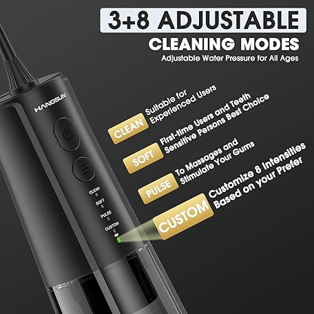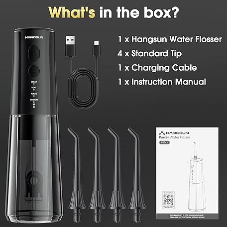 Thông tin sản phẩm Hangsun Water Flosser for Teeth Cordless Oral Irrigator - 4 Modes 300ML Rechargeable IPX7 Waterproof for Braces, Sensitive Gums, Home & Travel Use (Black)