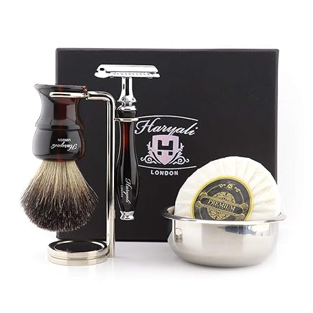 Haryali London 5 Pc Double Edge Safety Razor With Pure Black Badger Hair Brush, Stand, Soap And Bowl Shaving Kit For Mens Perfect New Year Gift Set