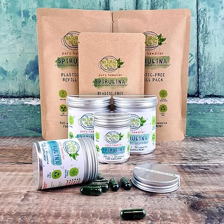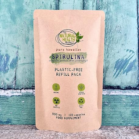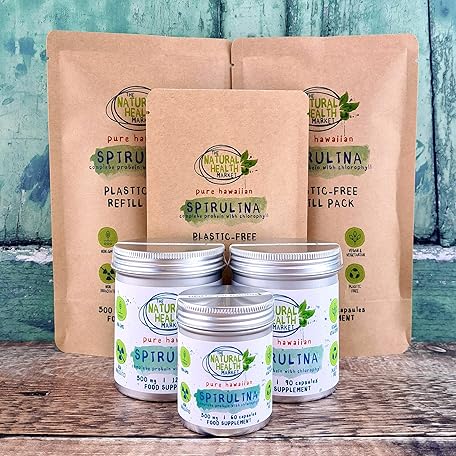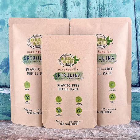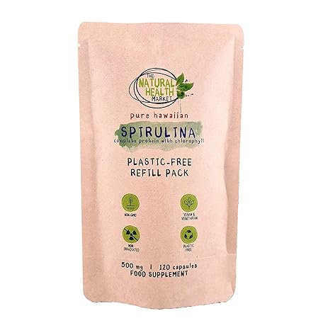 Sản phẩm Hawaiian Spirulina Capsules 500mg by The Natural Health Market - 100% Pure - No Additives - Plastic Free Packaging - Made in England - Vegan-Friendly Supplement (120 Capsule - Pouch) đang được bán với giá ưu đãi là $25.7022 tại nước Anh.