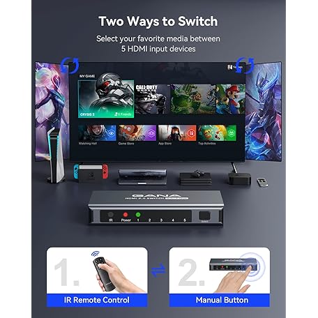 Thông tin sản phẩm HDMI Switch 5 in 1 Out 4K@60Hz, GANA HDMI Splitter Switcher with Remote, Aluminum HDMI 2.0 Switch Box Hub for 3D, HDCP2.2, HDR, Compatible with Xbox, PS5/4/3,Fire Stick,Roku,Blu-Ray Player