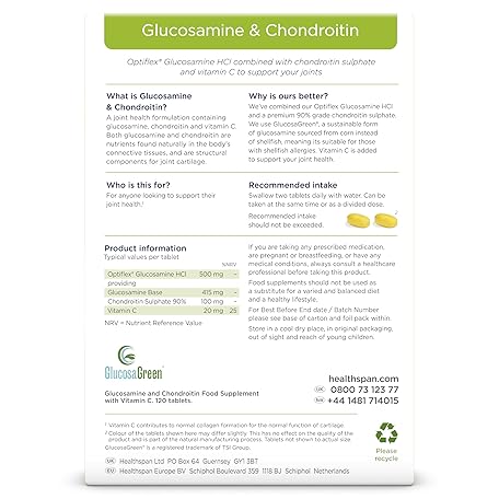 Sản phẩm Healthspan Glucosamine and Chondroitin (120 Tablets) | Joint Health | 500mg Optiflex Glucosamine & 100mg Chondroitin Sulphate | 20mg Vitamin C | 40% More Glucosamine Per Gram | Sustainably Sourced đang được bán với giá ưu đãi là $26.269 tại nước Anh.