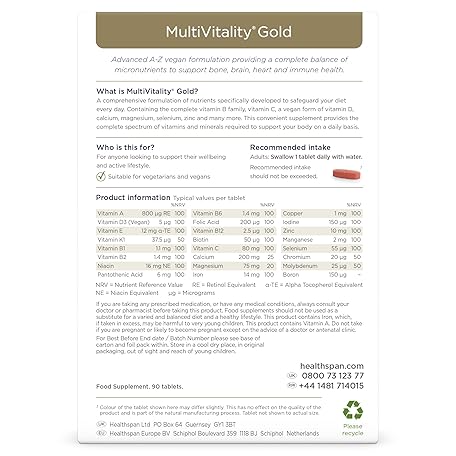Thông tin sản phẩm Healthspan Multivitamin Gold | A-Z Formulation | Wellbeing & Immune Support | Algal Source Vitamin D3 | Vitamins A, B, C, D, E & K | Calcium, Iron, Magnesium, Selenium & Zinc | Vegan (180 Tablets)