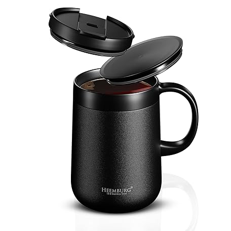 Heemburg Double Wall Vacuum Insulated 18/8 Stainless Steel Thermal Coffee Mug with Handle, Includes 2 Lids, Non-Slip Base, Ideal for Office or Workplace