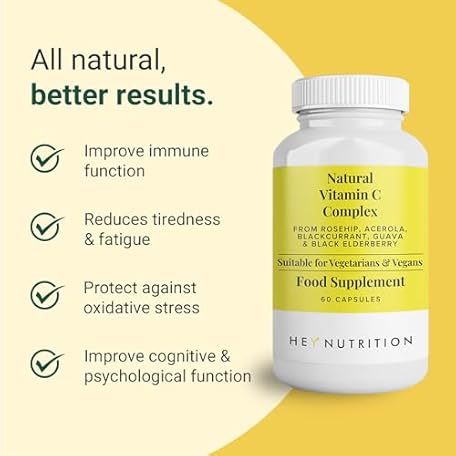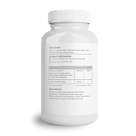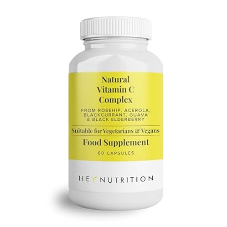 Thông tin sản phẩm Hey Nutrition Natural Vitamin C 250mg Complex from Rosehip, Acerola, Blackcurrant, Guava, and Elderberry - Immune Function, Stress, Metabolic Health, & Fatigue - Non-GMO, 60 Vegan Capsules