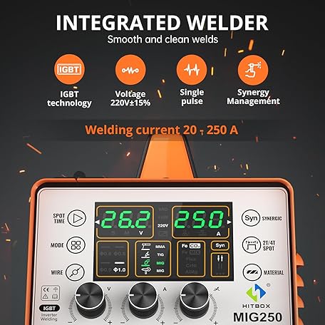 Thương hiệu HITBOX là cái tên nổi tiếng được rất nhiều khách hàng trên thế giới chọn lựa. Với kiểu dáng đẹp mắt, sang trọng, sản phẩm HITBOX 6 in 1 MIG Welder Gas/Gasless 250A 240V LED Digital MIG Welding Machine Flux Solid Wire MIG ARC Lift TIG Inverter Welders, Aluminum Weldable(MIG250) là sự lựa chọn hoàn hảo nếu bạn đang tìm mua một món cho riêng mình.