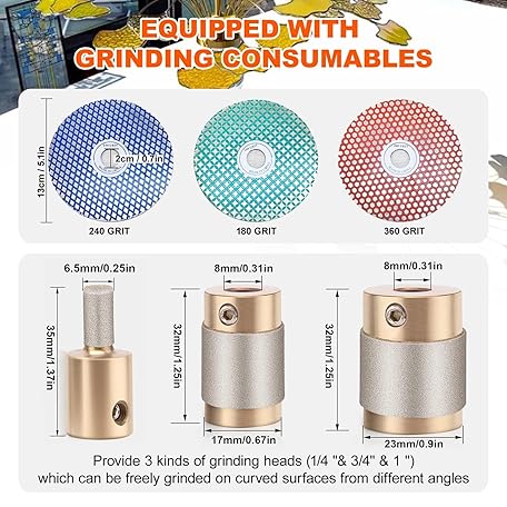 Thông tin sản phẩm HLGKBY Portable Mini Grinder Machine with 1/4"&3/4"&1" Grinding Head+180/240/360 Grit Grinding Disc+Water Pump for Beginners, 2 in 1 Professional Glass Angle Grinder, Grinding curves & edge angles